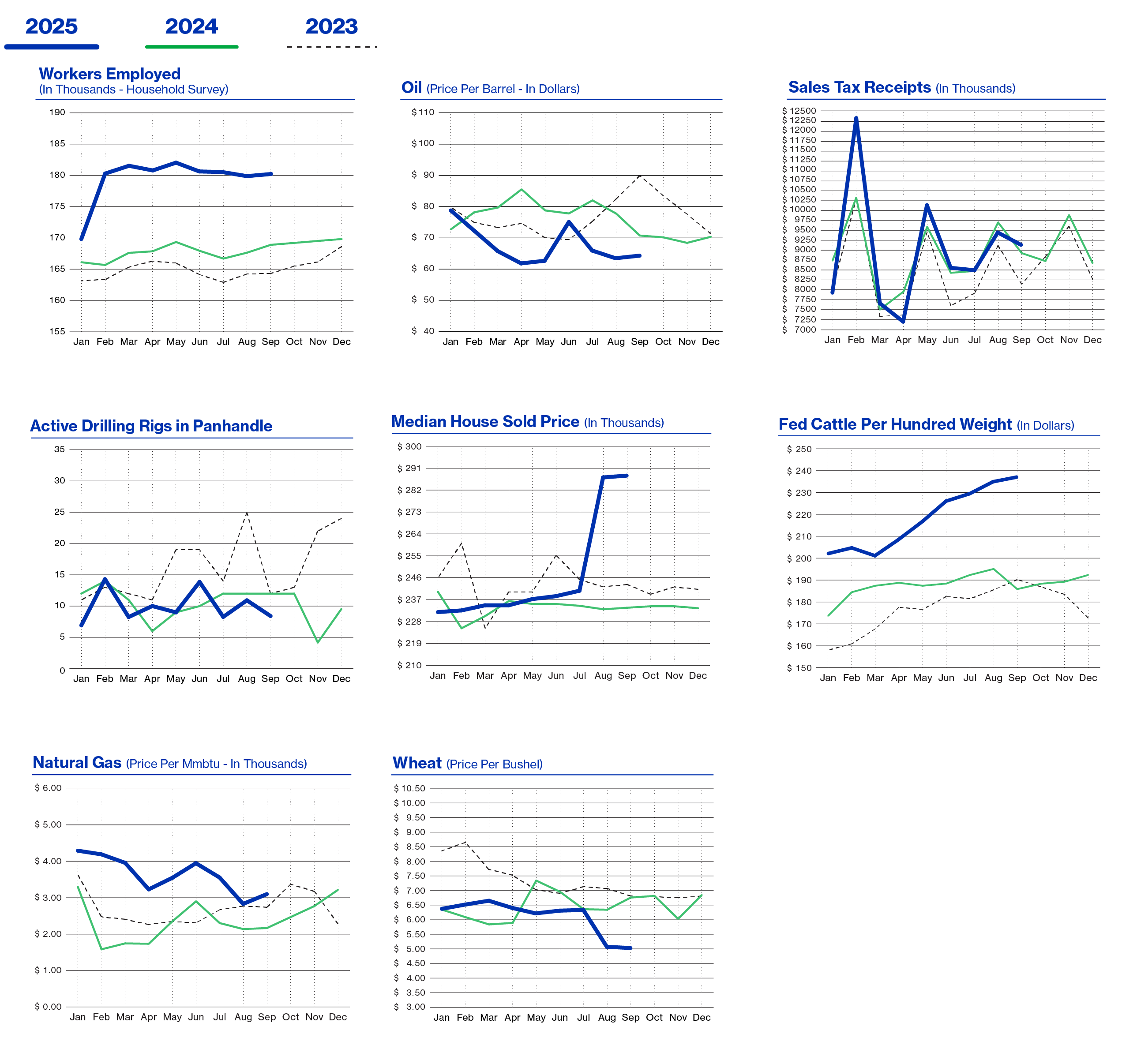 Energy markets posted mixed results. As of August 2025, oil prices were down 9.29% compared to a year earlier, while natural gas prices surged 28.93%. The number of active oil rigs fell from 12 in August 2024 to 8 in August 2025.